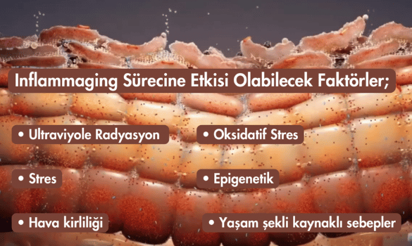 Yaşlanma süreci boyunca cildimiz metabolik olarak aktif yaşlanan hücreleri biriktirmektedir. Bu birikmiş hücreler, uzun vadede cildin mikro ortamını bozmaya zemin oluşturarak bariyer fonksiyonuna zarar verebilmektedir. Bununla birlikte ultraviyole radyasyon, kirlilik, cilt bariyerine zarar veren uygulamalar gibi faktörlere maruz kalmak da inflamasyonun devreye girmesine sebebiyet vermektedir. İşte burada inflamasyonun sürekli olarak devreye girmesi yani kronikleşme durumu, cilt yaşlanmasına dolayısıyla da cildimizin inflammaging ile karşı karşıya kalmasına neden olabilmektedir. Daha geniş kapsamı ile inflammaging sürecine etkisi olabilecek faktörler ise;