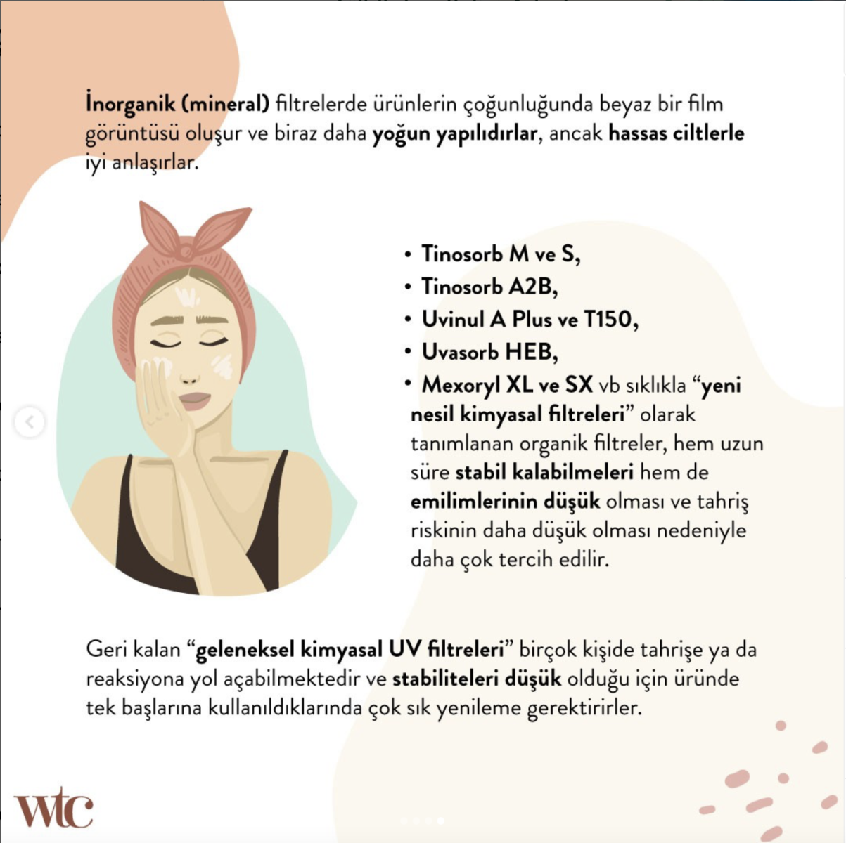 İnorganik (mineral) filtrelerde ürünlerin çoğunluğunda beyaz bir film görüntüsü oluşur ve biraz daha yoğun yapılıdırlar, ancak hassas ciltlerle iyi anlaşırlar. Tinosorb M ve S, Tinosorb A2B, Uvinul A Plus ve T150, Uvasorb HEB, Mexoryl XL ve SX vb sıklıkla “yeni nesil kimyasal filtreleri” olarak tanımlanan organik filtreler, hem uzun süre stabil kalabilmeleri hem de emilimlerinin düşük olması nedeniyle tahriş riskinin daha düşük olması nedeniyle daha çok tercih edilir. Geri kalan “geleneksel kimyasal UV filtreleri” birçok kişide tahrişe ya da reaksiyona yol açabilmektedir ve stabiliteleri düşük olduğu için üründe tek başlarına kullanıldıklarında çok sık yenileme gerektirirler.